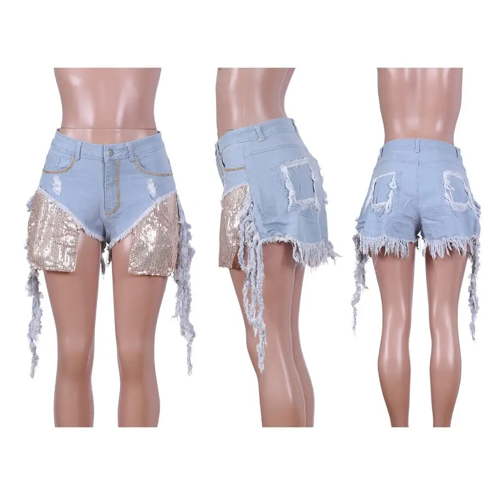 Images of Adogirl Sequins Pockets Diamonds Jeans Shorts Size Holes Tassel Washed Denim Shorts Women Fashion Sexy Trousers Club Pants :